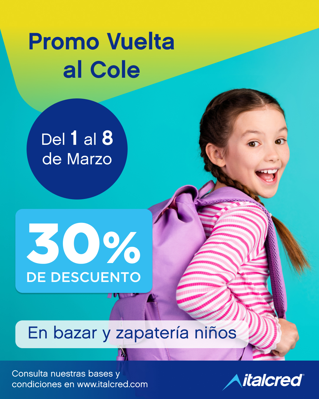Beneficio válido para compras realizadas con las tarjetas ITALCRED Cred, Cash, Plus y Class, desde el 1 al 8 del mes de Marzo de 2026 en Bazares y calzados para niños. Consulte locales de venta adheridos en www.italcred.com.ar El descuento se efectúa en el resumen de cuenta, aplicándose exclusivamente sobre los primeros $16.700.- de su compra. Tope máximo de reintegro por día por cuenta $5.000.- El 30% de descuento es válido sobre los consumos realizados tanto por el titular de la tarjeta como por sus adicionales en forma conjunta. Ver coeficientes de interés vigentes en https://italcred.com/novedades-2/. CFT contiene Tasa de Interés. Cuotas fijas en pesos y Sistema de Amortización Francés. Los valores expresados no incluyen IVA. El porcentaje de descuento aplica sobre el monto de compra y el reintegro se realiza en la primera cuota. Entidad responsable: ITALCRED S.A., CUIT: 64257950-5, teléfono: 0810-222-3344, Tte. Gral. Juan Domingo Perón 537 – Piso 5 – CP (C1038AAK) Ciudad Autónoma de Buenos Aires.